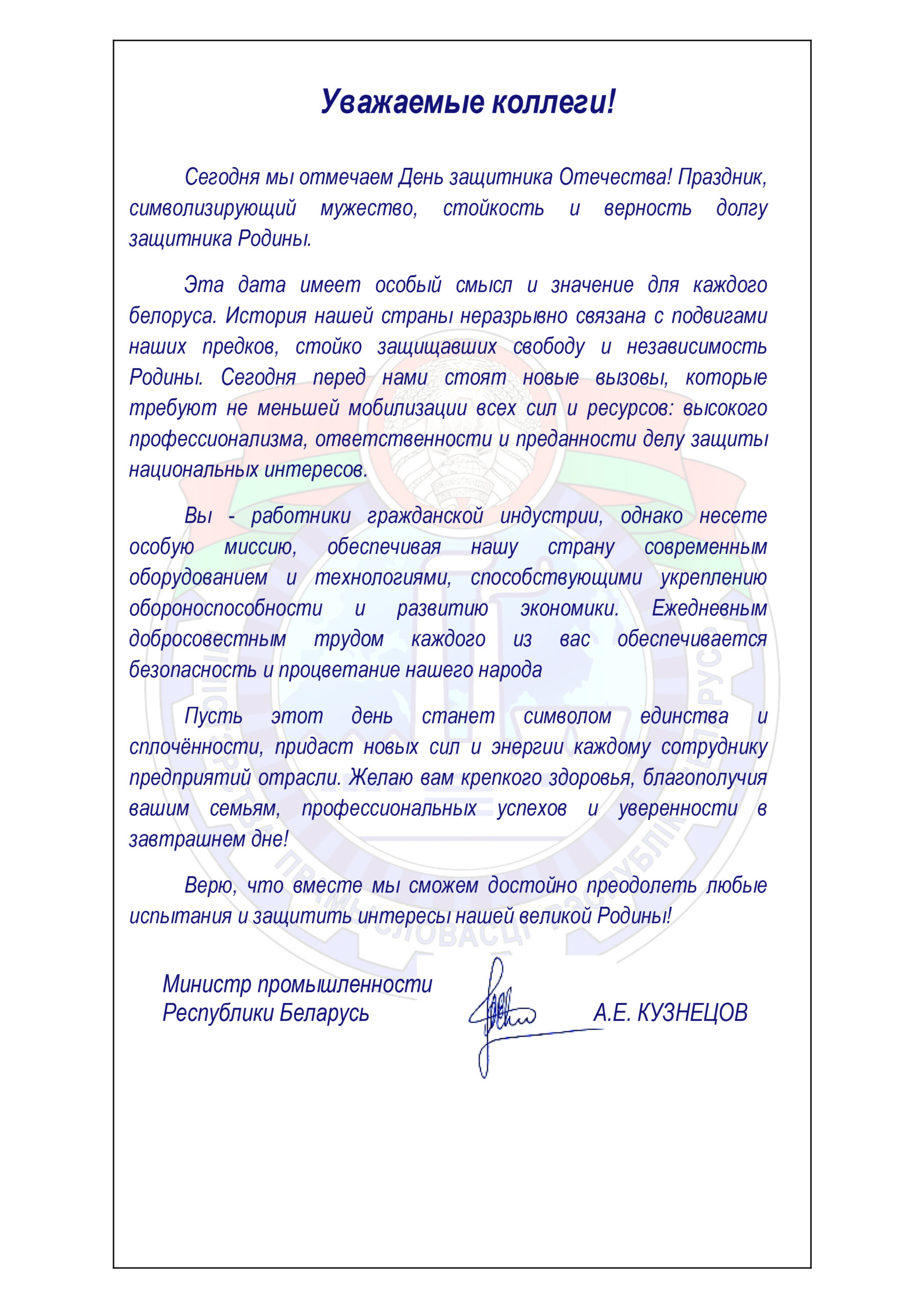Поздравление Министра промышленности А.Е. Кузнецова с Днем защитника Отечества и Вооруженных сил Республики Беларусь Актуально 18 февраля 2026 в 12:24